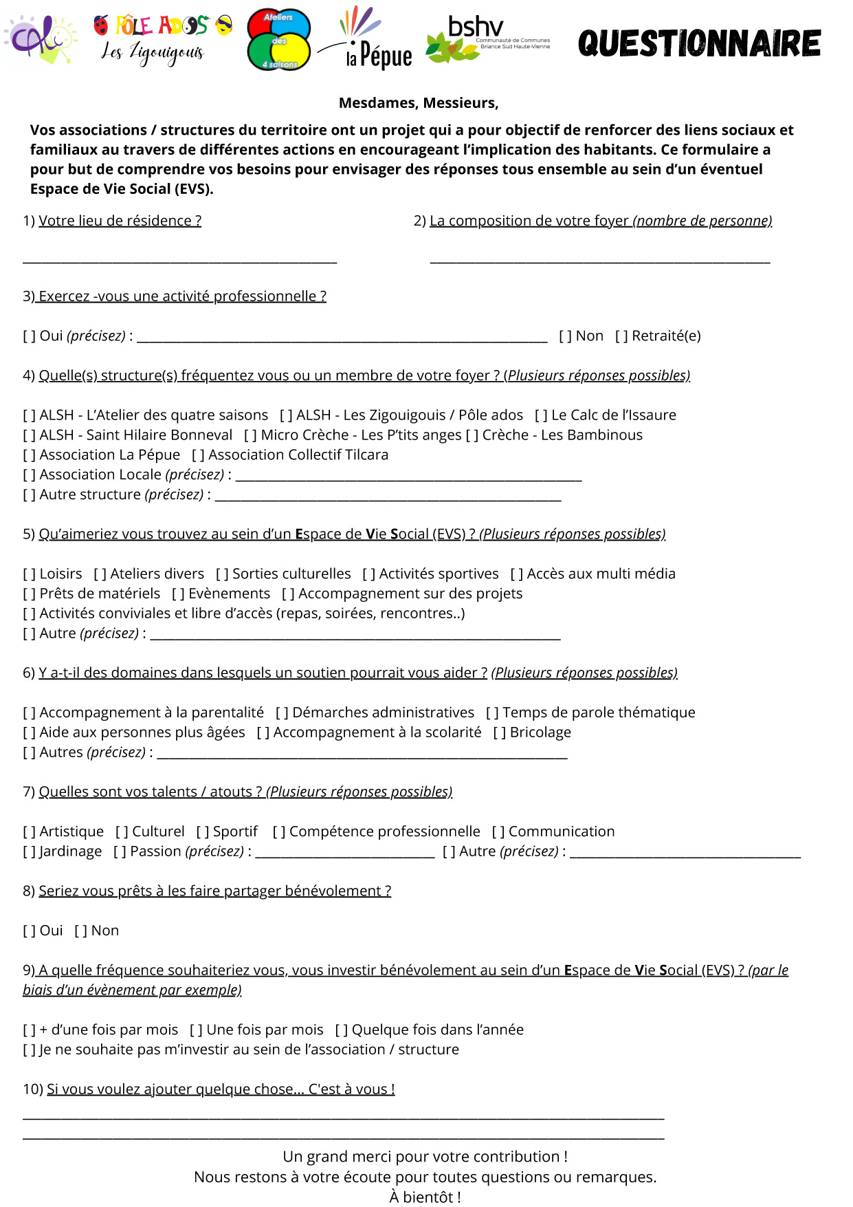 Ce questionnaire est destiné à l’ensemble de la population du territoire afin de connaitre leurs attentes et besoins, d’identifier certaines volontés dans le cadre d’un futur projet d’espace de vie sociale.